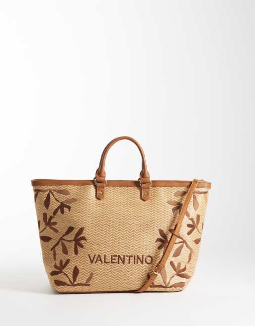Valentino – Ko Re – Große Bast-Tragetasche in Neutral mit Blumenprägung