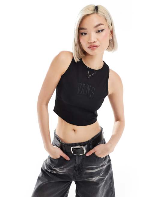 Vans – Kurz geschnittenes Tanktop in Schwarz mit College-Logo