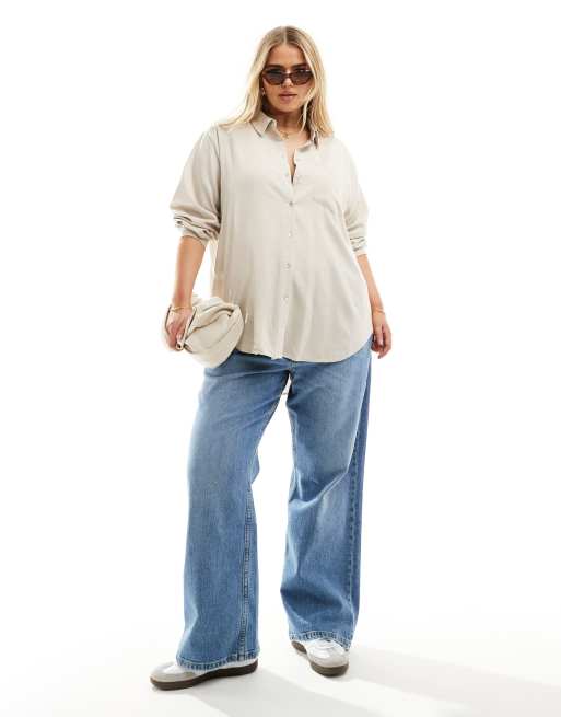 Vero Moda Curve – Langärmlige Hemdbluse aus Leinenmix in Steinbeige