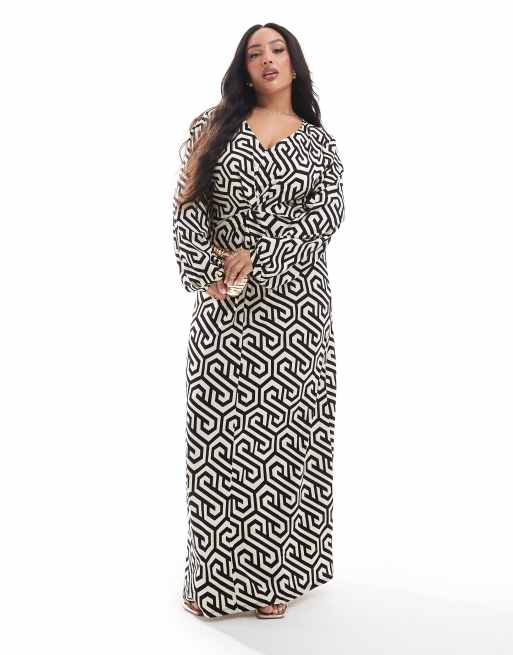 Vero Moda Curve – Maxikleid mit geknoteter Vorderseite und abstraktem Muster in Schwarz-Weiß