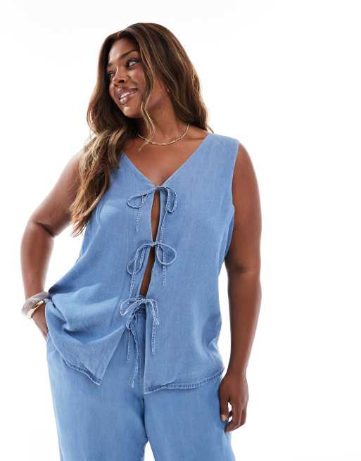 Vero Moda Curve – Oberteil aus blauem Chambray mit Bindedetail vorn, Kombiteil