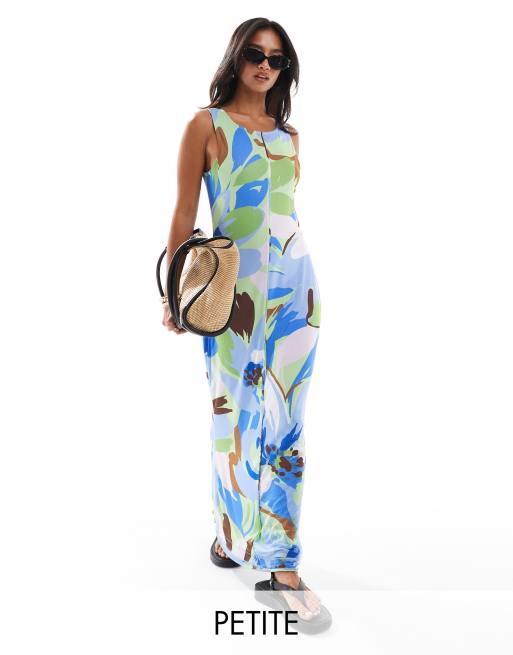 Vero Moda Petite – Ärmelloses Netzstoff-Kleid mit Kräuselsaum und blauem Blumenmuster