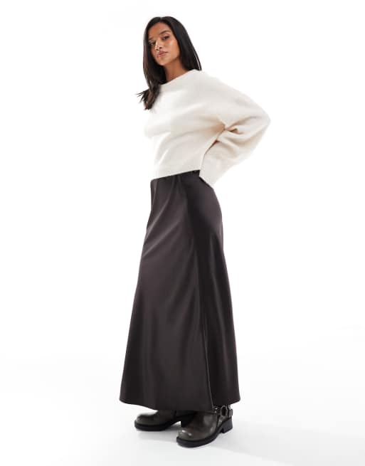 Vero Moda Petite – Asymmetrischer Satin-Midirock in Schokobraun