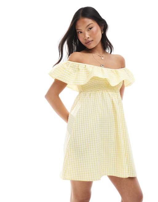 Vero Moda Petite – Minikleid in Gelb mit Vichy-Karos, gesmoktem Oberteil und Rüschen-Detail