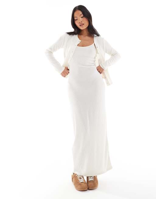 Vero Moda Petite – Weiches, geripptes Set in Cremeweiß, aus Strickjacke und Trägerkleid