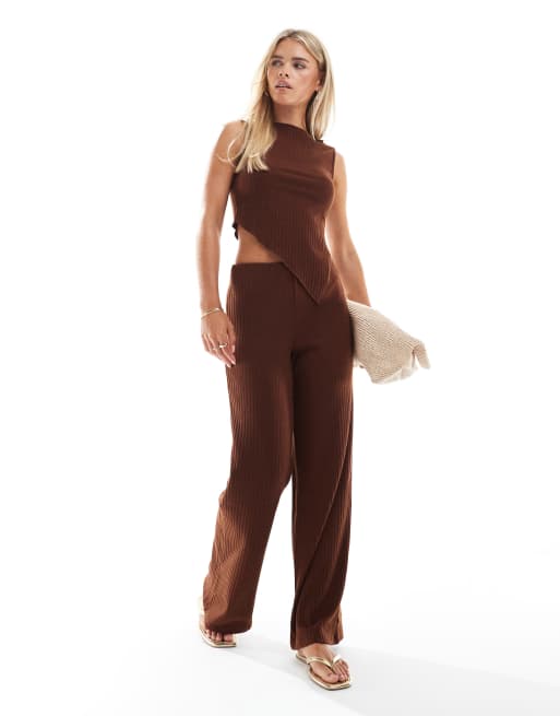 Vero Moda – Set in Schokobraun bestehend aus geripptem, ärmellosem Oberteil mit asymmetrischem Saum und Hose mit weitem Bein