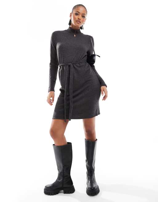 Vero Moda Tall – Hochgeschlossenes Strick-Minikleid in Schwarz mit Bindebund
