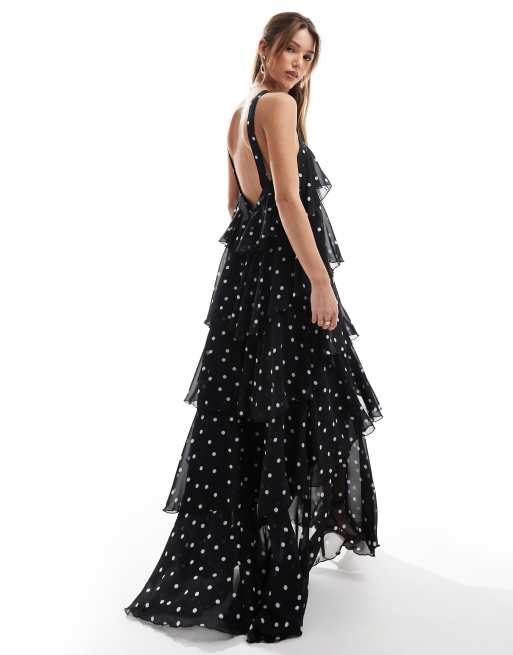 Vero Moda – Felicia – Gestuftes Neckholder-Maxikleid in Schwarz mit Punkten und Ansteckblumendetail