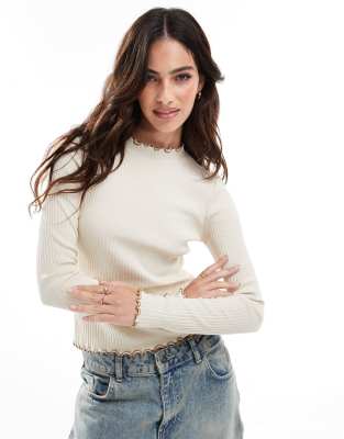 Vero Moda – Geripptes, langärmliges Oberteil in Cremeweiß mit Kontraststreifen in Hellbraun