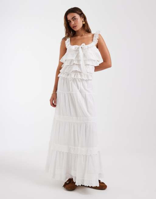 Vero Moda – Gestufter Boho-Maxirock in Weiß mit Falten und Spitzendetail, Kombiteil