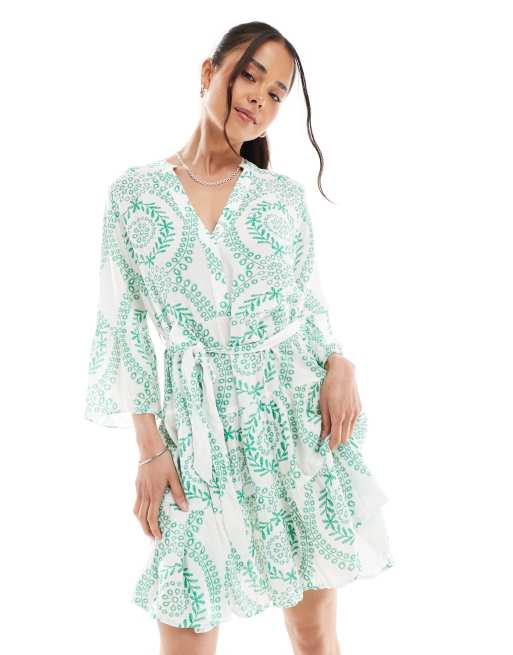 Vero Moda – Kleid mit Kachel-Blumenprint in Grün, Glockenärmeln und Bindegürtel
