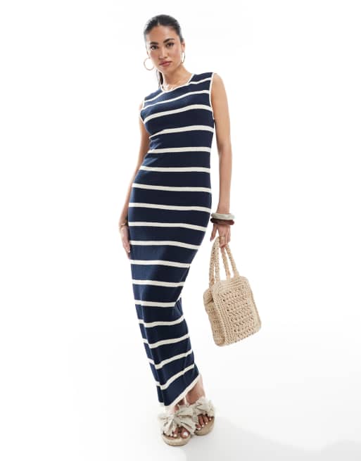 Vero Moda – Knöchellanges, gestricktes Jersey-Kleid in gestreiftem Marineblau