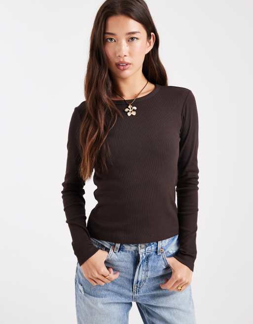 Vero Moda – Langärmliges, geripptes Oberteil in Braun mit knappem Schnitt