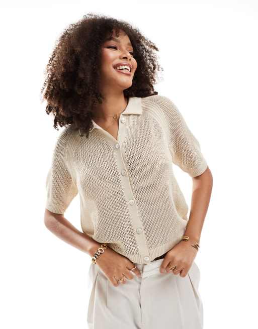 Vero Moda – Leichtes, grobmaschiges, kurzärmliges Boxy-Fit-Hemd in Hellbeige