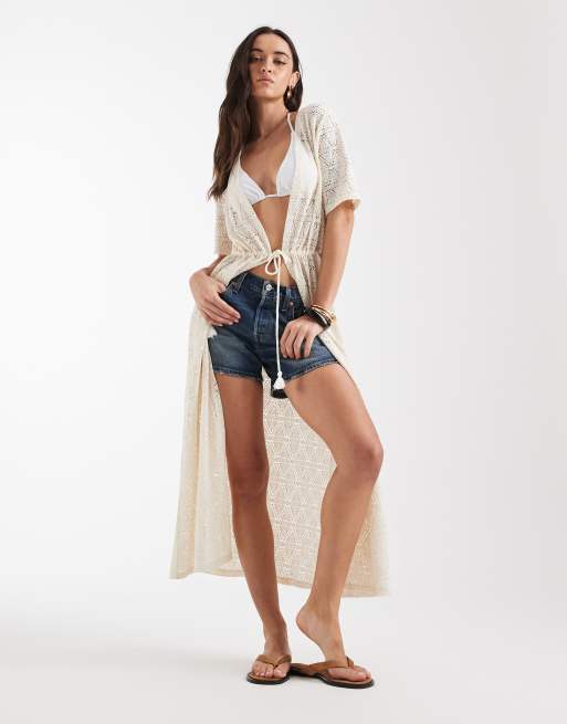 Vero Moda – Maxi-Strandkleid aus Stretch-Spitze in Cremeweiß mit gebundener Vorderseite