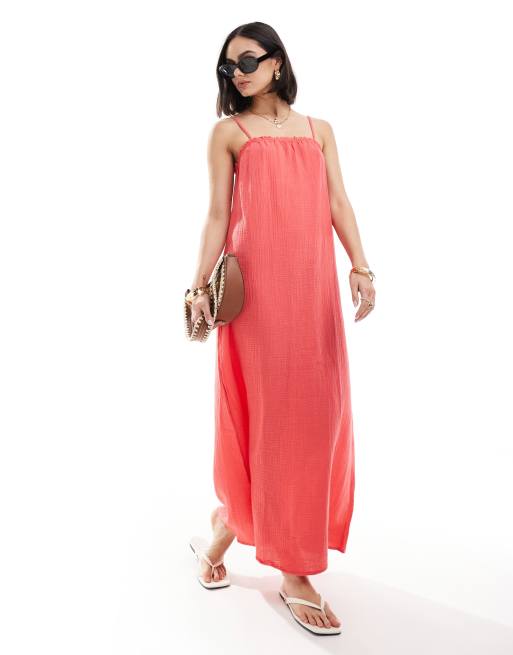 Vero Moda – Maxikleid in Mohnrot mit Riemchenträgern