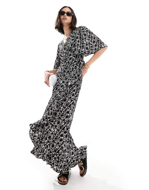 Vero Moda – Maxikleid in Schwarz mit gewickelter Vorderseite und abstraktem Muster