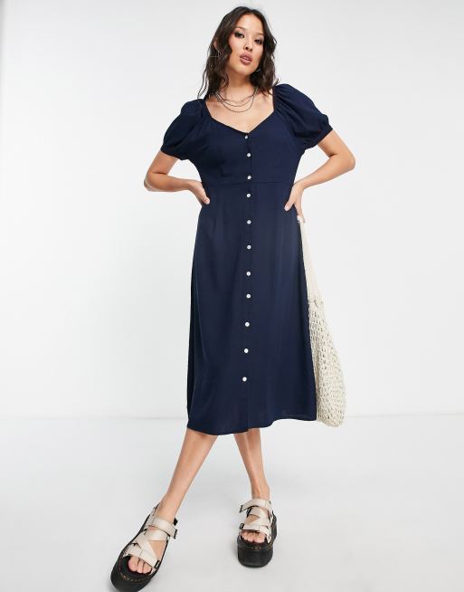 Vero Moda – Midikleid in Marineblau mit kurzen Puffärmeln und V-Ausschnitt
