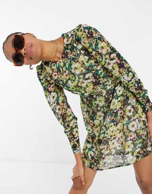 Vero Moda – Mini-Skater-Kleid in Grün geblümt
