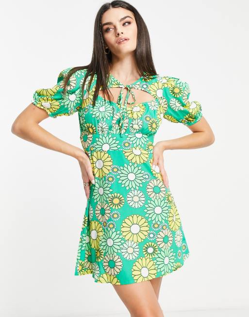 Vero Moda – Minikleid in Grün mit Bindebändern am Ausschnitt, Herzausschnitt und Retro-Blumenmuster