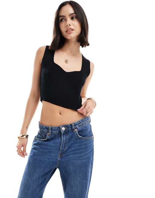 Vero Moda – Rippstrick-Oberteil in Schwarz mit Herzausschnitt