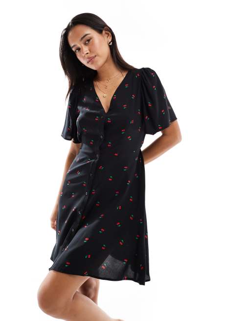 Vero Moda – Skater-Minikleid in Schwarz mit Knopfleiste und Kirschmuster