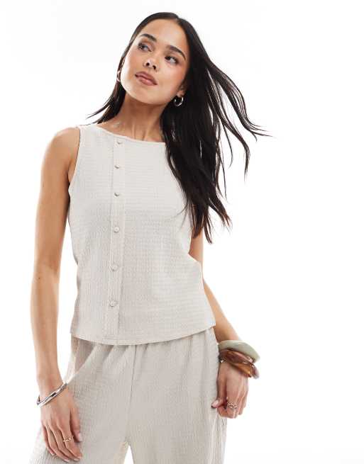 Vero Moda – Strukturiertes Jersey-Oberteil in Beige mit asymmetrischer Knopfleiste, Kombiteil