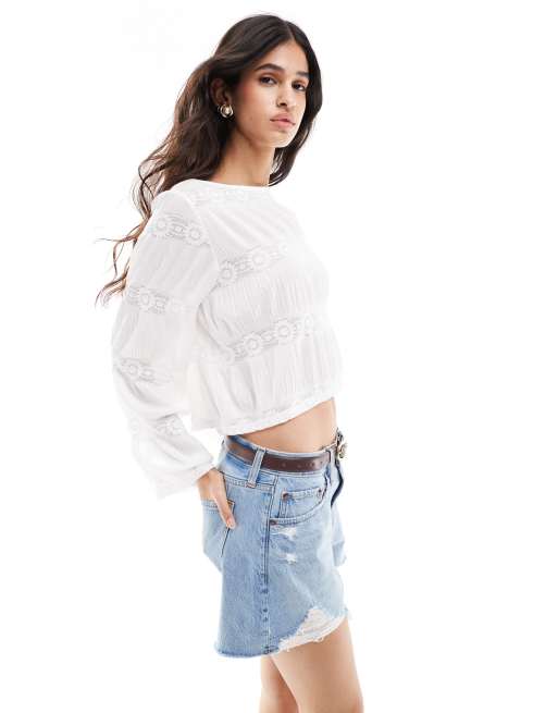 Vero Moda – Strukturiertes, langärmliges Jersey-Oberteil in Weiß mit U-Boot-Ausschnitt