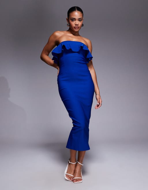 Vesper – Trägerloses Midikleid in Kobaltblau mit gerüschtem Umschlag am Ausschnitt