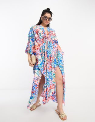 Vila Curve – Langer Strandkaftan in Blau mit Blumenmustermix