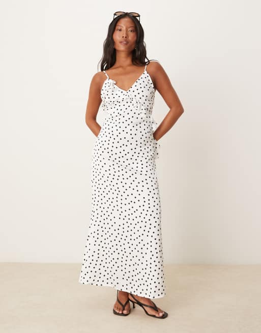 VILA Petite – Schwarz gepunktetes Maxi-Trägerkleid in Weiß mit Korsagen-Detail und Rüschenverzierung