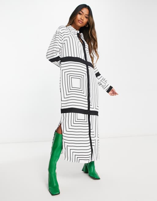 Vila – Gemustertes Maxi-Hemdblusenkleid aus Satin in Schwarz-Weiß