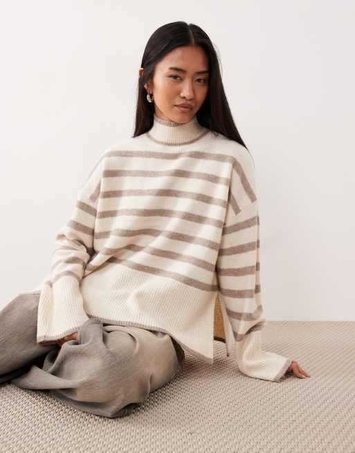 VILA – Gestreifter Pullover in Cremeweiß und Beige mit hohem Kragen