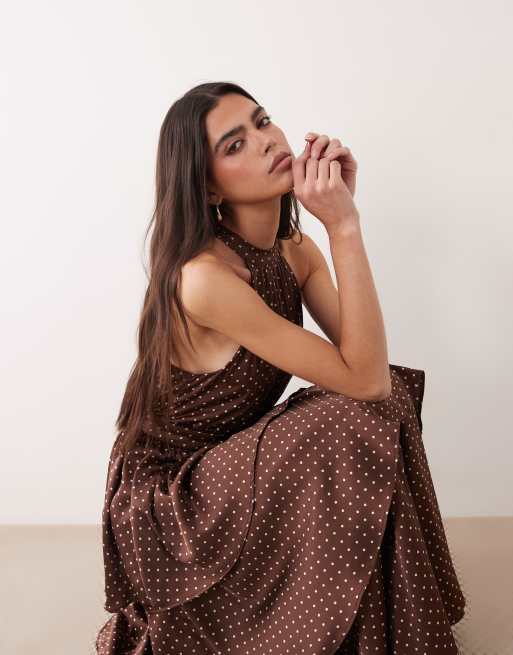 Vila – Gestuftes Neckholder-Maxikleid in Schokobraun mit Punktemuster