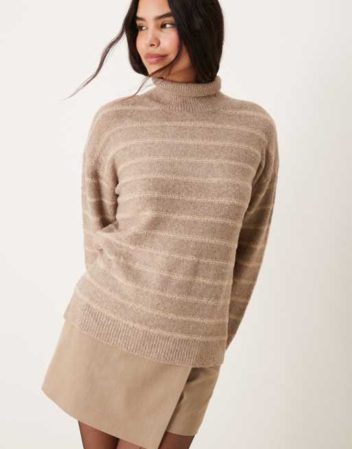 VILA – Hochgeschlossener, strukturierter Strickpullover in Beige mit farblich abgestimmten Streifen