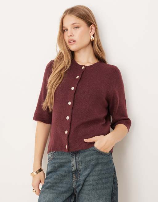 VILA – Kurzärmlige Strickjacke in meliertem Burgunderrot