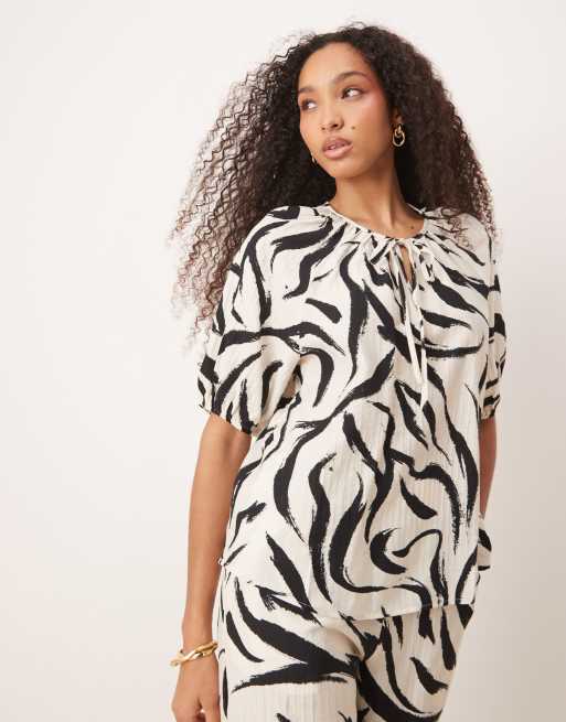 VILA – Kurzärmliges Oberteil mit Muster in Schwarz-Weiß und Bindedetail am Ausschnitt, Kombiteil