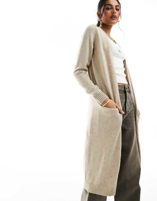 Vila – Lang geschnittene Strickjacke in Beige