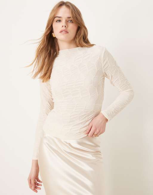 VILA – Langärmliges, hochgeschlossenes Top in Birkencreme mit Struktur