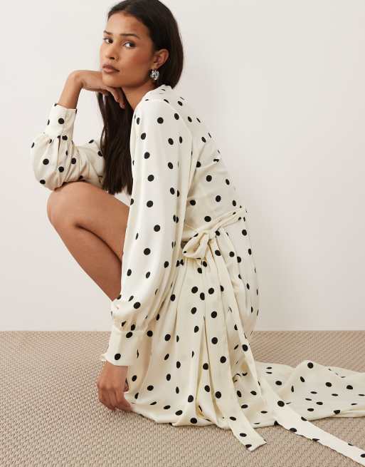 VILA – Langärmliges Wickel-Midikleid aus Satin in Cremeweiß mit Punktemuster