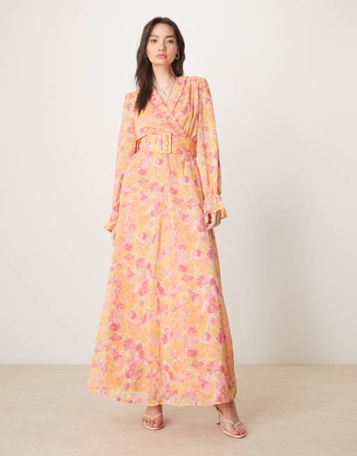 Vila – Langes Wickelkleid aus Chiffon mit floralem Print in Orange