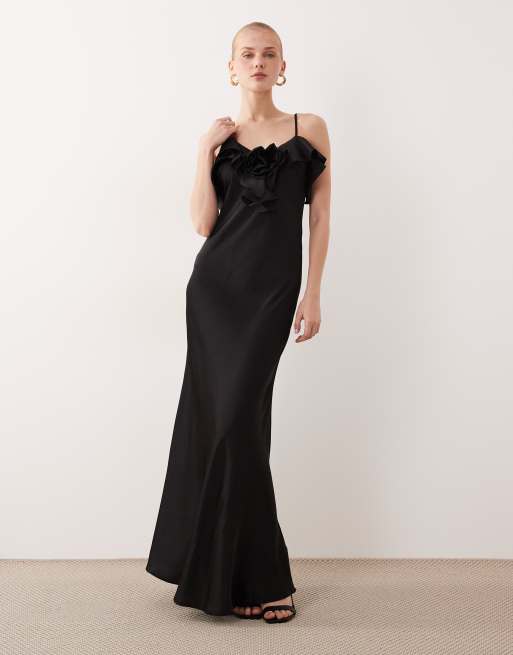 VILA – Maxi-Trägerkleid aus schwarzem Satin mit Rüschendetail
