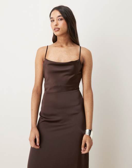 VILA – Maxikleid aus Satin in Schokobraun mit Wasserfallausschnitt