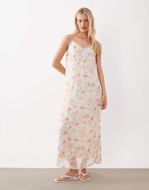 VILA – Midi-Trägerkleid in Weiß mit Spitzenborte und blauem Blumenmuster