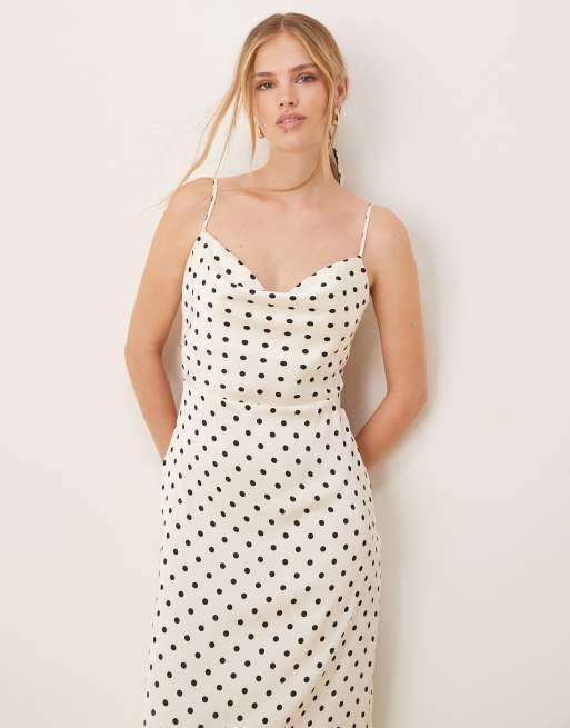 VILA – Midikleid aus Satin in Weiß mit schwarzem Punktemuster