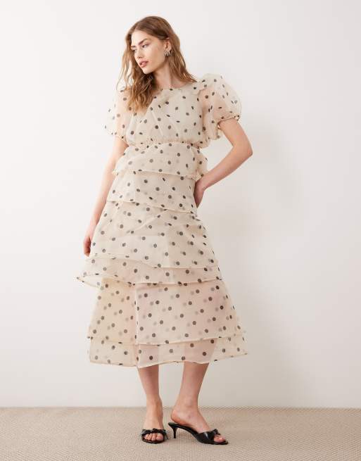 Vila – Midikleid in Creme mit Polka-Dots, voluminösen Ärmeln und Rüschen