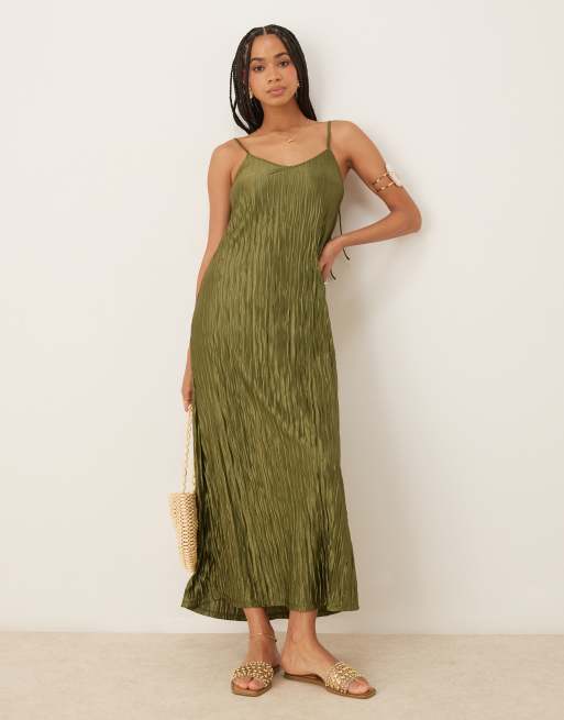 VILA – Plissiertes Maxi-Trägerkleid in Olivgrün