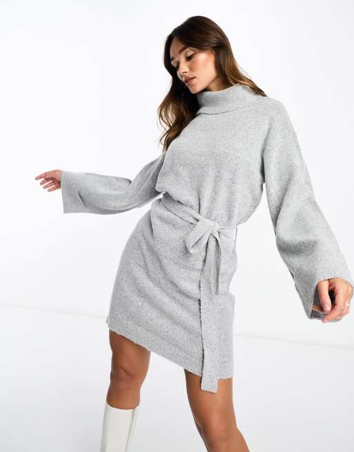 Vila – Pulloverkleid in Hellgrau mit Rollkragen und Taillenschnürung