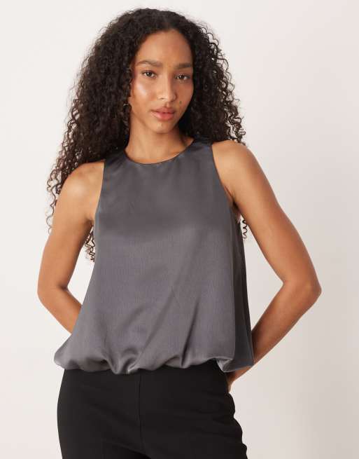 VILA – Satin-Oberteil in Granitgrau mit Ballonsaum