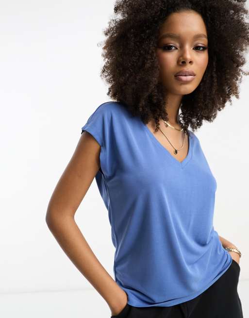 Vila – Weich fallendes T-Shirt in Staubblau mit V-Ausschnitt